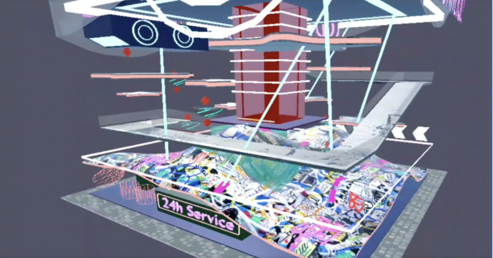 「One the one hand, It creates a relaxing atmosphere: urban stage, street elements, roof gardens, where people can escape from reality; on the other hand, under those masks are empty and dying bodies」