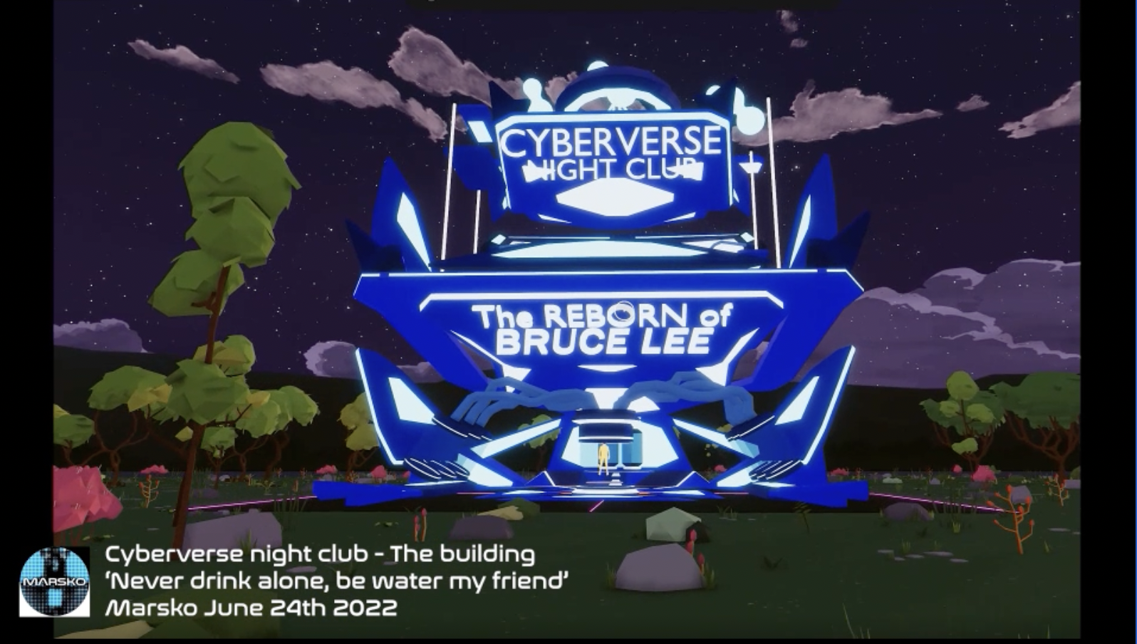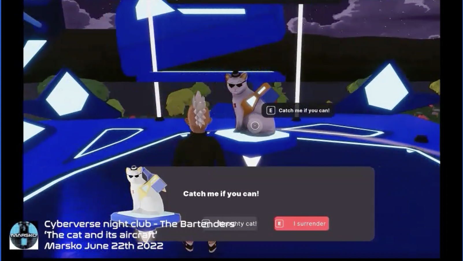 「Catch the cat if you can! Learn the touching story between the bartender Abura Dabuda and his naughty cat. Only in the cyberverse night club. Lee will reborn tonight! Do not miss it! Free Admissoin!!!」