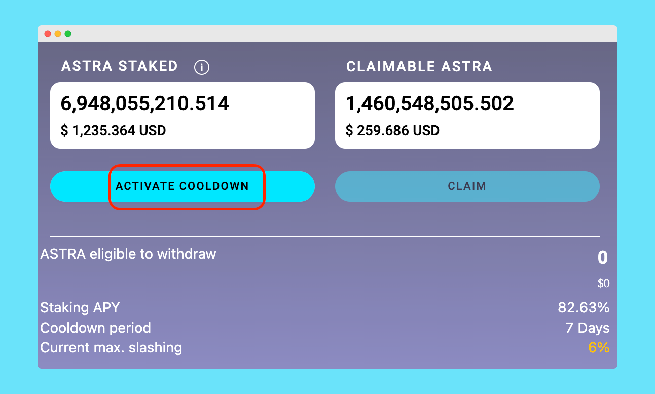 Unstake your LP or ASTRA Tokens after your three months staking period is completed. To withdraw your staked ASTRA tokens, click and activate the cool-down period on the Staking page. After 7 days, click on the Unstake button to unstake your tokens. There is no slashing fee.