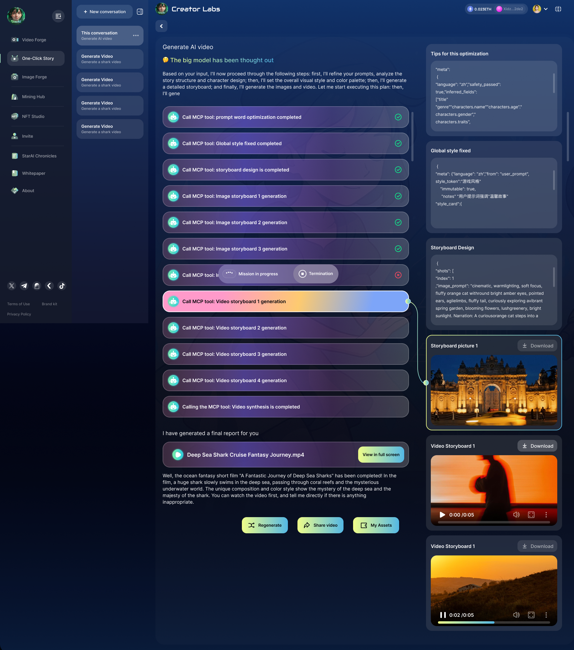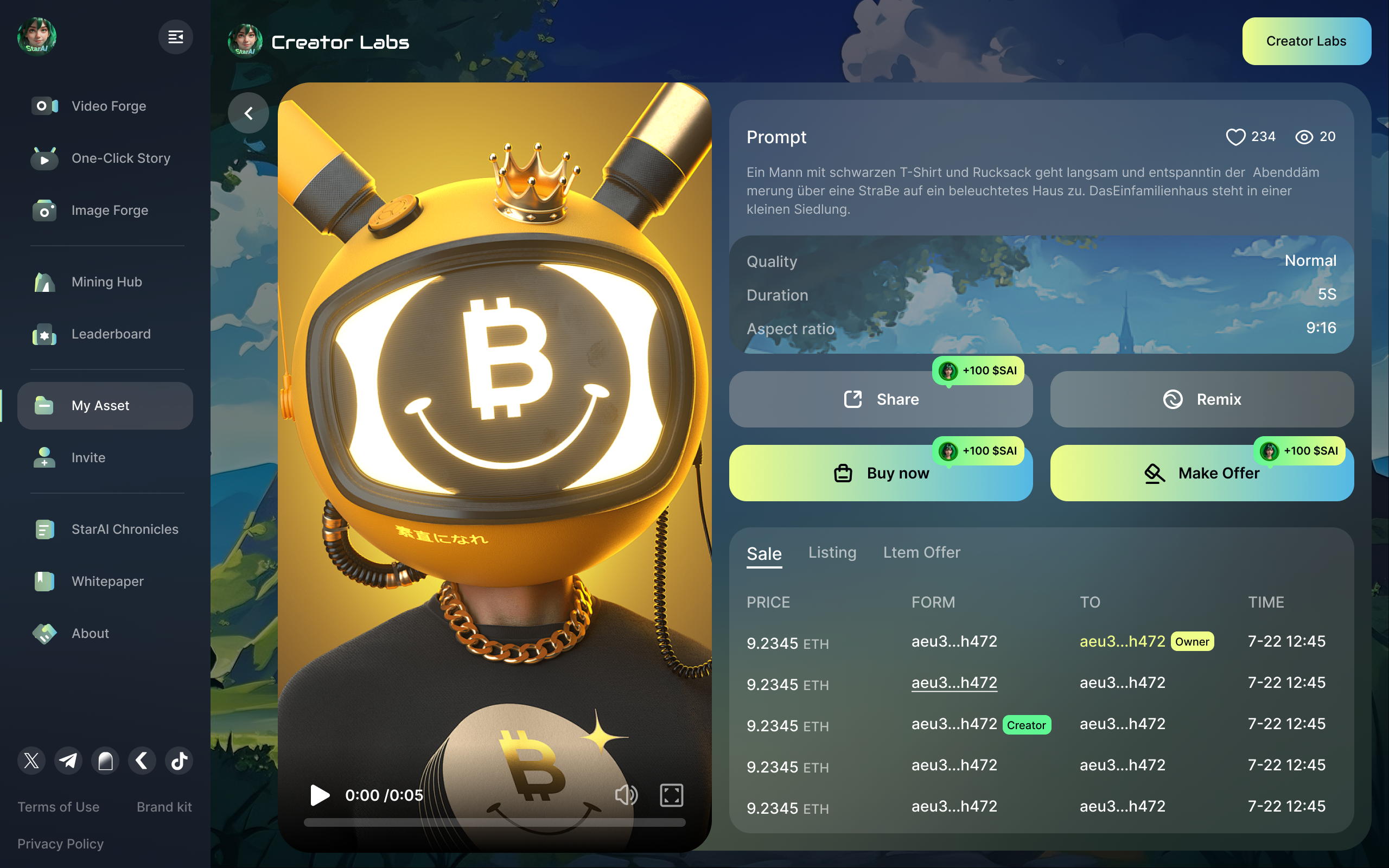 StarAI Genesis is not just a toolbox. Our vision is to build the world’s first AI multi-modal assetization marketplace, enabling AI works to be owned, traded, and circulated—just like NFTs, and beyond.