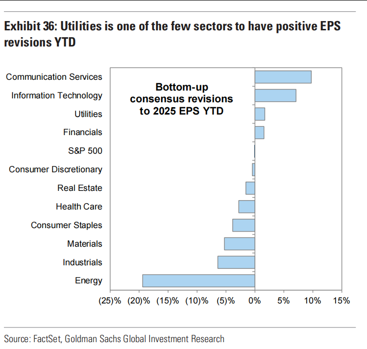 至于公用事业行业的逻辑,则是因为其比较强的防御属性,能够较好对冲风险,而且这个行业也是年初以来少有的经历了EPS上调的行业之一,从图中可以看到上调EPS前两名的行业都是跟AI相关的成长性行业,第三名是公用事业。