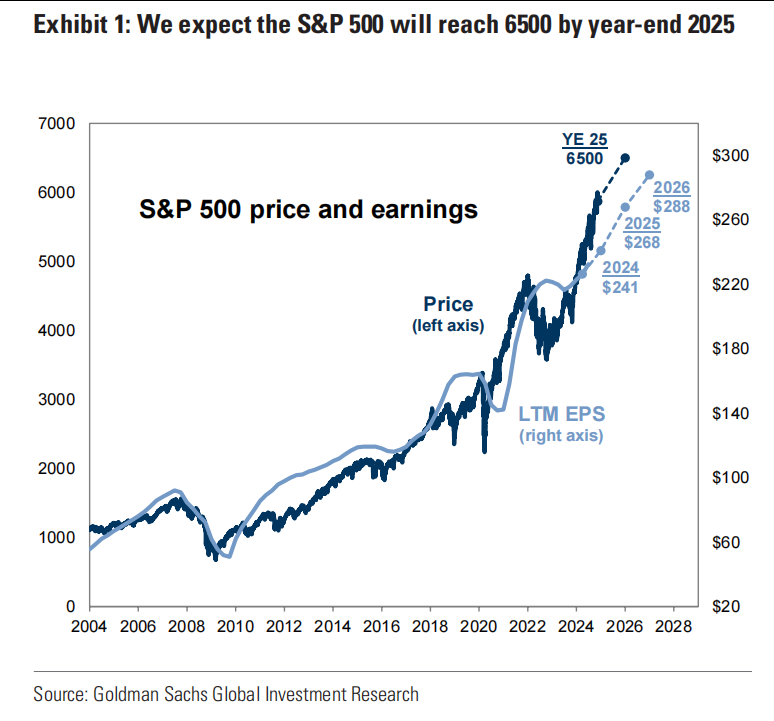 预计到2025年底标普500指数会上涨到6500点,收益率为11%:企业盈利方面,过去两年高盛的预测还是比较准确的,这次高盛认为标普500指数2025年和2026年的美股净利润分别增长到268和288美元/股,分别增长11%和7%;