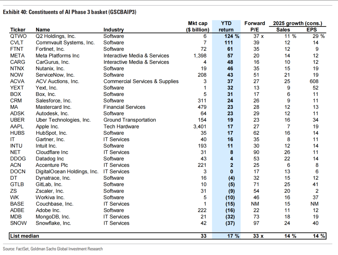 高盛给出的第三阶段的AI投资标的主要是一些软件和服务类公司,下面是供大家参考的整理表。