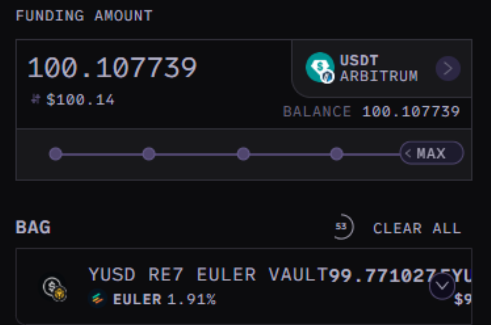 4. Choose the asset you want to use to deposit into the vault and input the desired amount. For this example, we’ll be using USDT on Arbitrum to deposit into the Re7 vault.
