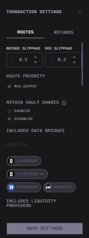 You can adjust the slippage and choose the preferred bridging/swapping solutions.