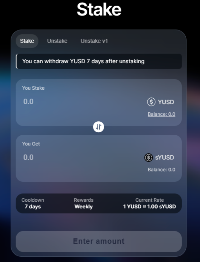 Users can now stake their YUSD for sYUSD again. The only difference compared to the previous staking mechanism is that a 7-day cooldown period begins after a user initiates unstaking, not after staking their YUSD.To stake your YUSD, head over to the stake tab.
