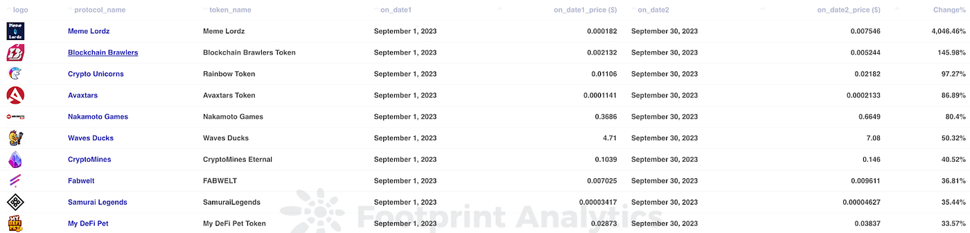 In September, a total of 13 projects experienced a notable surge in token price, surpassing a 20% increase. These sustained growth rates serve as a testament to the potential of these projects and their ability to capture the attention and interest of investors within the dynamic realm of GameFi.