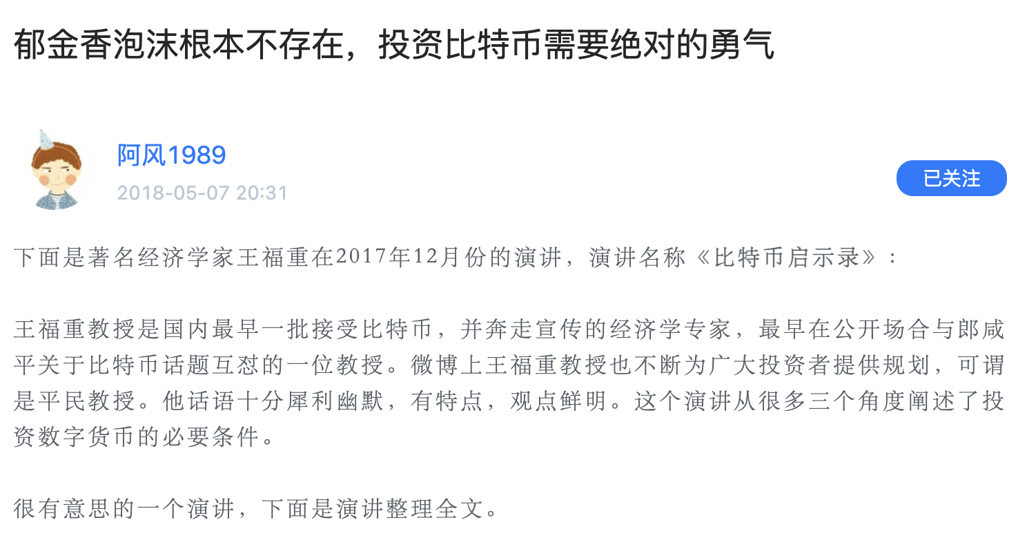 下面是著名经济学家王福重在2017年12月份的演讲,演讲名称**《比特币启示录》**: