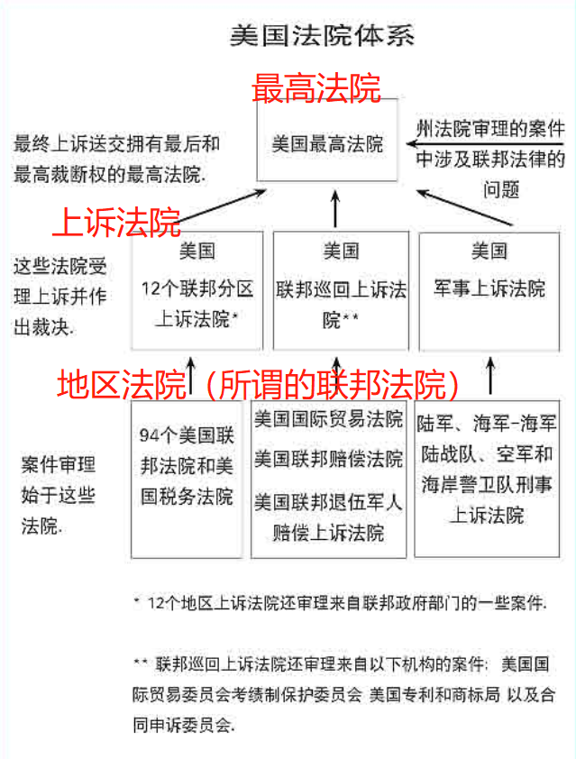 关于美国的法院体系,见下图。我们所看到的所谓的“美国联邦法院”,本质上就是美国地区法院,只是美国法院体系众多法院中的一个,而绝对不是美国最高法院,甚至也绝对不是美国上诉法院。