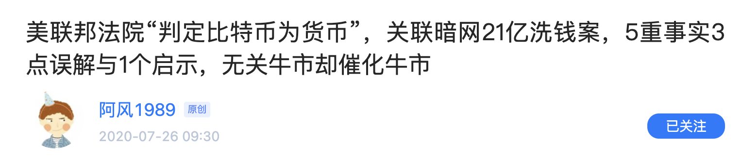 关于7月25日凌晨前后发生的“比特币被美联邦法院判定为货币”一事,国内不少媒体进行了一波疯狂转载,不了解详情的国内投资者,甚至在朋友圈惊呼“2020年,比特币10万美金不是梦”,还有人认为“人们对比特币的接受程度正在从量变变为质变”,认为“变天了”。