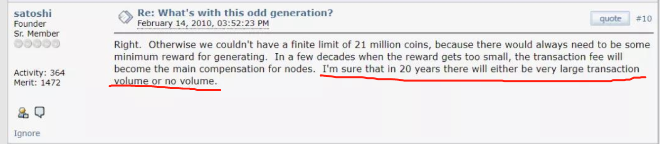 2010 年 2 月 14 日,中本聪在 bitcointalk.org 论坛发帖: “我敢肯定,在20年内,比特币的交易量要么很大,要么没有。”