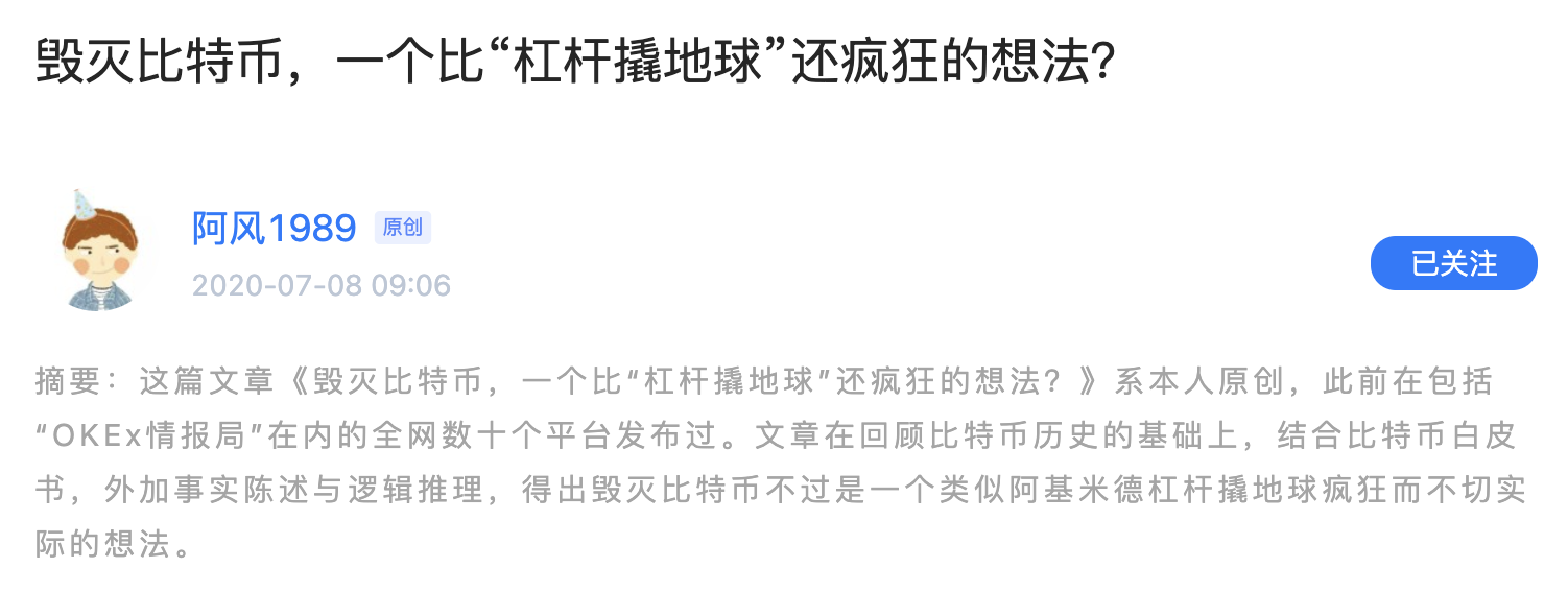 摘要:这篇文章《毁灭比特币,一个比“杠杆撬地球”还疯狂的想法?》系本人原创,此前在包括“OKEx情报局”在内的全网数十个平台发布过。文章在回顾比特币历史的基础上,结合比特币白皮书,外加事实陈述与逻辑推理,得出毁灭比特币不过是一个类似阿基米德杠杆撬地球疯狂而不切实际的想法。