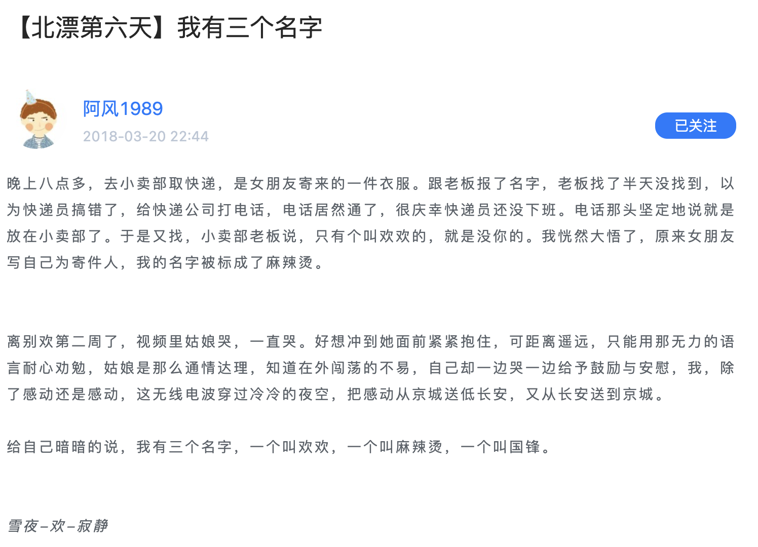 给自己暗暗的说,我有三个名字,一个叫欢欢,一个叫麻辣烫,一个叫国锋。