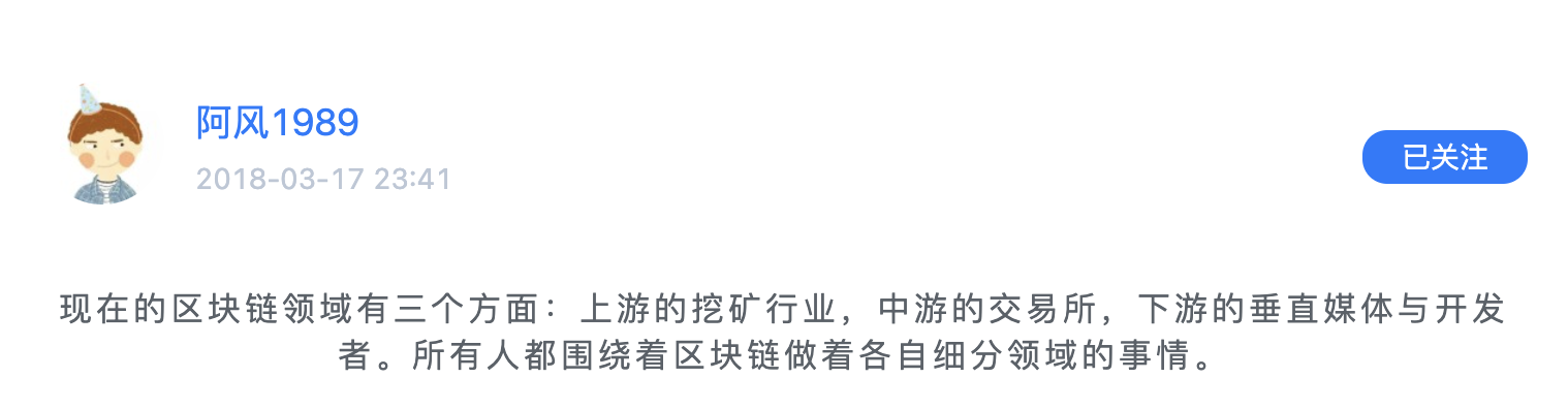 现在的区块链领域有三个方面:上游的挖矿行业,中游的交易所,下游的垂直媒体与开发者。所有人都围绕着区块链做着各自细分领域的事情。