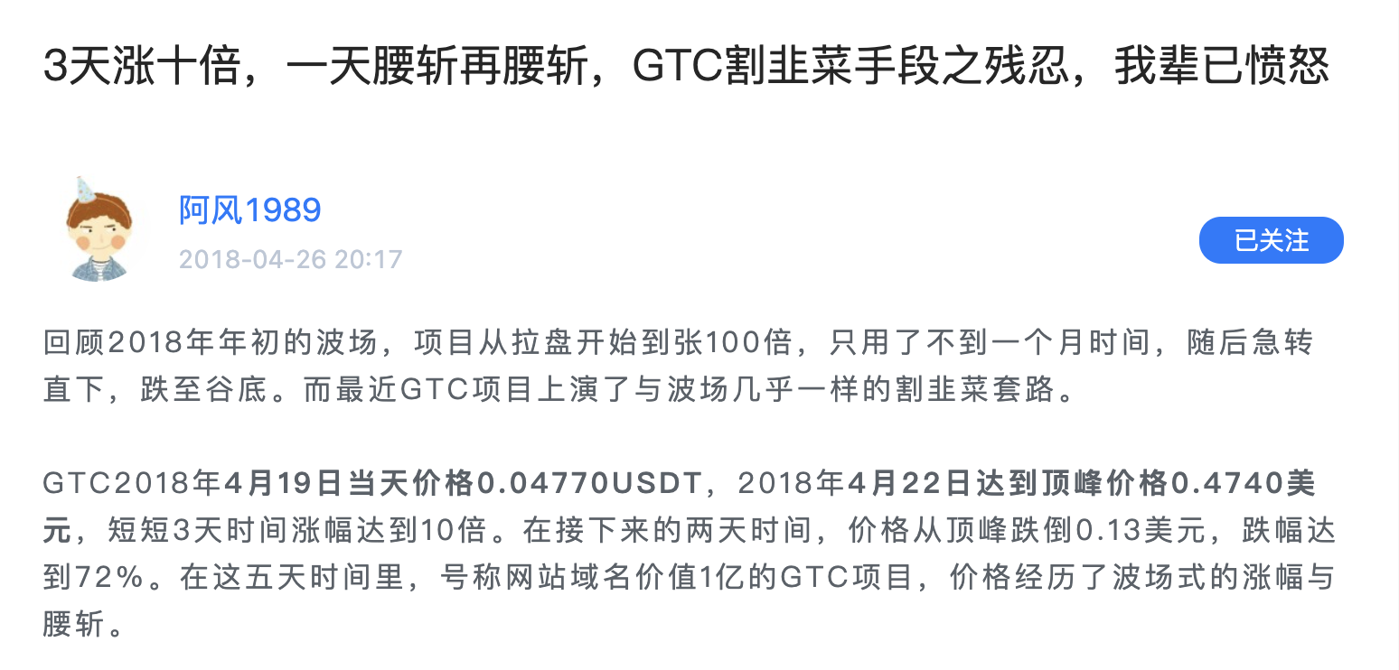 回顾2018年年初的波场,项目从拉盘开始到张100倍,只用了不到一个月时间,随后急转直下,跌至谷底。而最近GTC项目上演了与波场几乎一样的割韭菜套路。