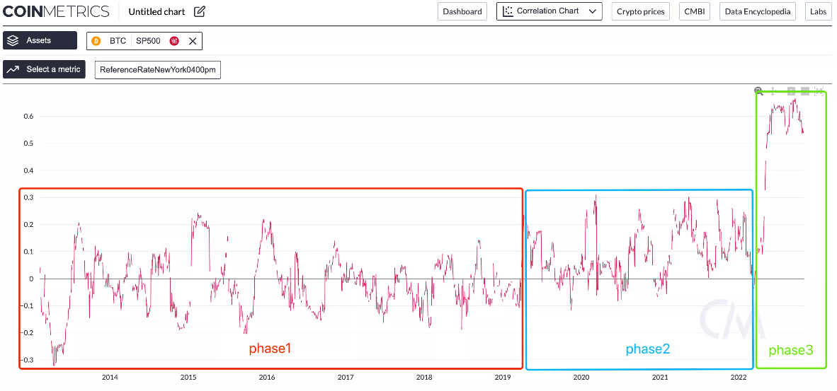 与此同时,加密市场也开始逐渐与美股股指绑定,比特币与S&P500相关性从原来的0±0.2,上升到0值上方,而到了2022年熊市期间,两者相关性甚至飙升至0.6左右,两者走势基本上分钟级同步,自此,加密市场最为主要的影响因素便转向宏大叙事:加息/美元指数/CPI/美股走势/衰退。