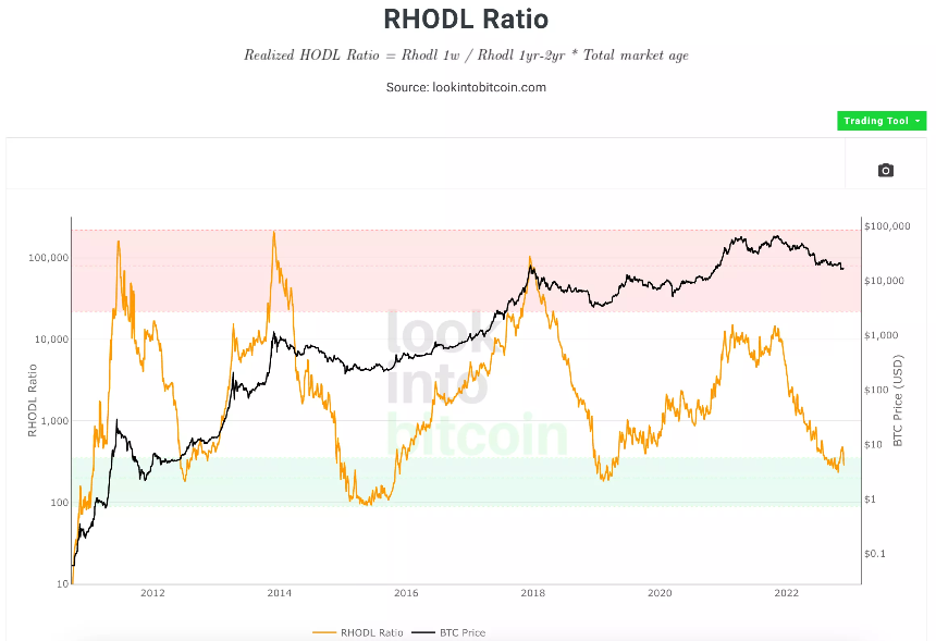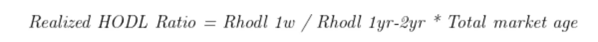 看起来挺唬人的,其根本目的是衡量UTXO小于1周与UTXO为1年到2年的比特币已实现价值(链上移动时的数量乘以当时的价格)的比值,该数值越大说明量上活跃度越高,反之则反之。该指标的有效之处在于不仅考虑某个时段移动的数量,还考虑到了价格因素。