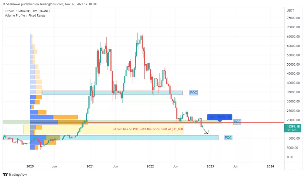 POC_port of call (by Volum Profile),是指基于成家量分布(by Volum Profile)看整个市场是否见底(port of call,触及安全港)。根据成交量分布数据,目前比特币价格已向下跌破16000美金,而从16000到10000美金,中间几乎没有有效成交作为支撑,该区域很容易被贯穿,POC_port of call (by Volum Profile)并不支持行情见底。