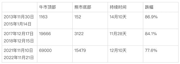 2013年11月30日比特币触及牛市顶部1163美金,至2015年1月14日触及熊市底部152美金,跌幅86.9%,用时14月10天;2017年12月17日触及牛市顶部19666美金,至2018年12月15日触及熊市底部3122美金,跌幅84.1%,用时11月28天;2021年11月10日触及牛市顶部69000美金,至2022年11月21日触及15479美金,跌幅77.6%,用时12月10天。
