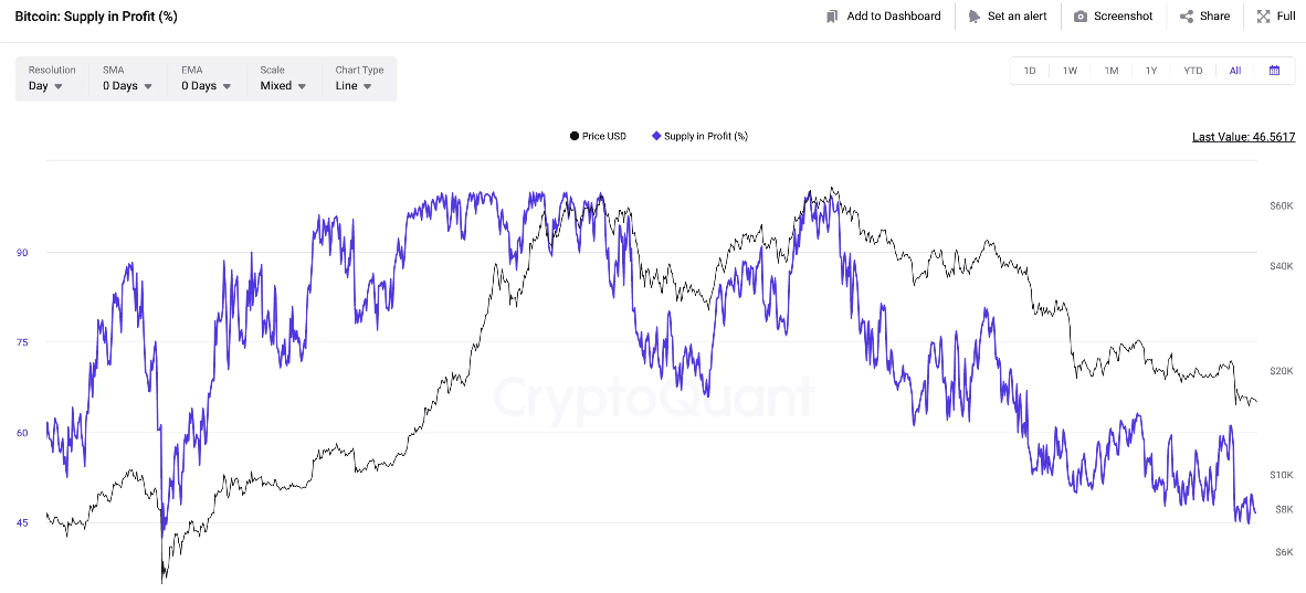 Bitcoin Supply in Profit (%)指标是指整个流通市场中,盈利的比特币占比特币总量,当比特币价格创新高时,该指标数据为100%,而根据历史数据,当Bitcoin Supply in Profit (%)触及40%时往往预示着一轮熊市底部到来,目前该数据为46%,并不支持行情见底。