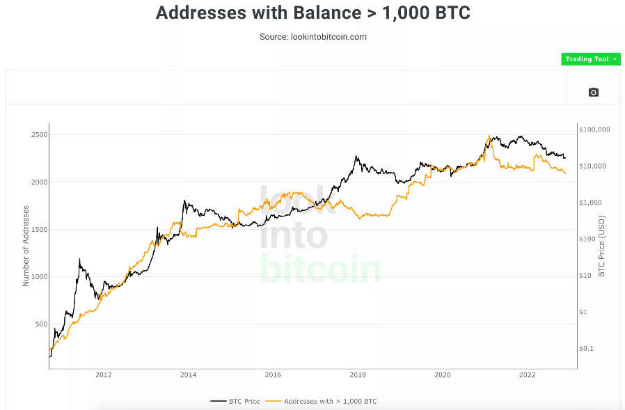 因此,Addresses with Balance > 1,000 BTC的下降可能预示着市场正在朝着深度熊市的方向迈进,这也与FTX暴雷对行业核弹级别暴雷对行业信心打击与未来的持续影响一致。