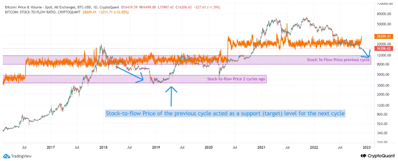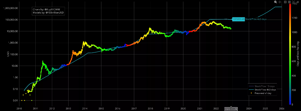 Stock-to-Flow Model即库存流量比模型,是推特大V PlanB根据已流通比特币数量与每年开采数量的比值。该指标在过去曾被认为是行业最为有效的预测比特币价格的指标之一,也曾在2021年下半年那轮反弹中完美贴合市场走势,但那似乎已成为他的高光时刻,在此后一年的表现并不出彩,例如该指标预测2022年一季度,比特币价格将达到10万美金,2022年12月31日的价格将为78,280美元,2023年12月31日的比特币价格预测为81,956美元,无论是已经发生还是尚未发生的,这些很显然是绝对不可能。