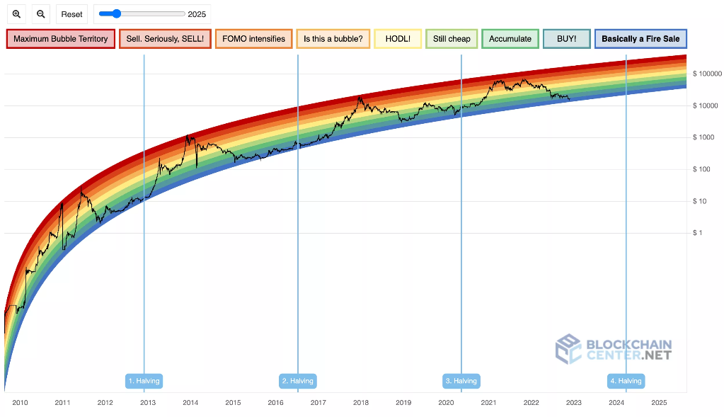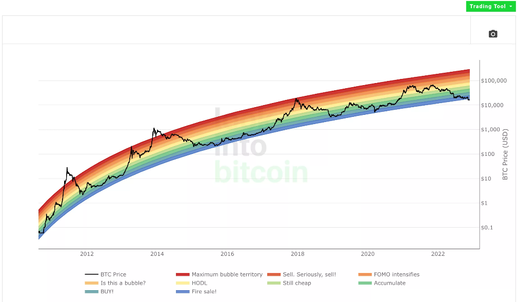 图中黑线为比特币的价格取对数,彩虹图不同色条标定价格处于不同区间,其中自上而下暗红色-最大泡沫区间,红色-卖出,棕红色-fomo时刻;黄色-思考是不是有泡沫了;明黄-持有;绿色-很便宜;青色-定投时刻;靛蓝-坚定买入;蓝色-清仓大甩卖时刻!