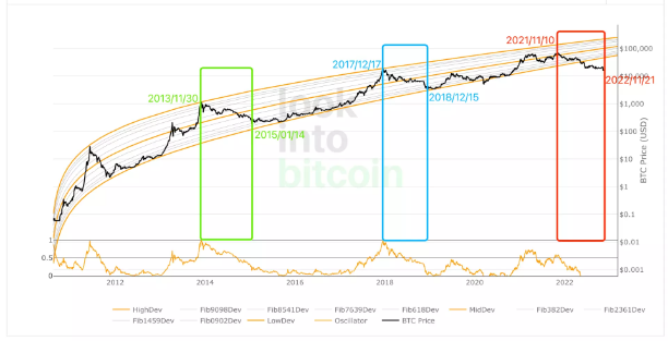 虽然该指标在这轮行情中几乎是失效的,但根据该指标调整后的数据显示(下图),本轮熊市底部将触及1万美金。