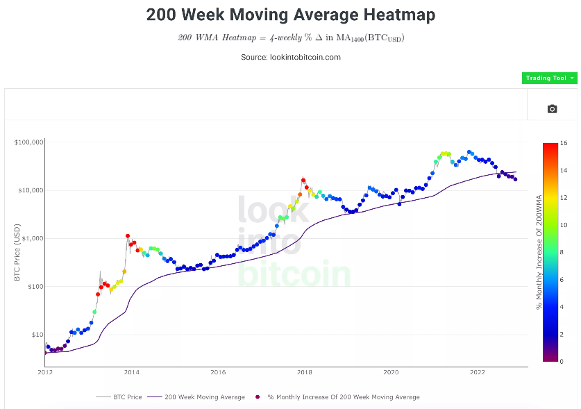 200 Week Moving Average Heatmap即200周移动平均热图,红色代表必须迈出了,而蓝色则意味着可以坚定买入,与彩虹图给出的指示基本一致。