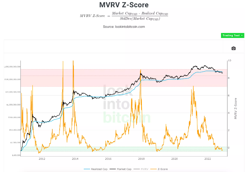 MVRV Z-Score,用比特币市场价值(流通数量*当下价格)减去已实现价值(已实现价格的平均值乘以流通数量),除以市场价值与已实现价值的标准偏差。