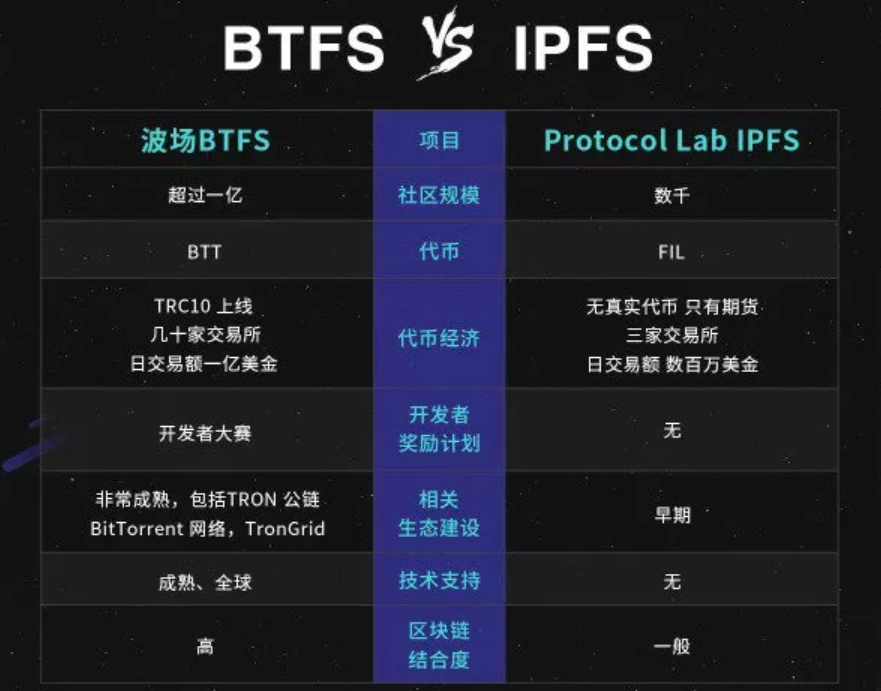 这组对比数据显示,BTFS社区规模超过一亿,而IPFS只有几千,BPFS拥有真实代币BTT,但是IPFS只有期货云云。