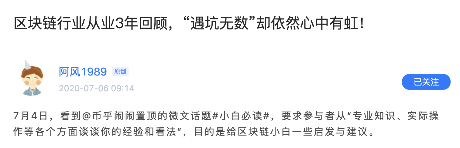 7月4日,看到@币乎闹闹置顶的微文话题#小白必读#,要求参与者从“专业知识、实际操作等各个方面谈谈你的经验和看法”,目的是给区块链小白一些启发与建议。