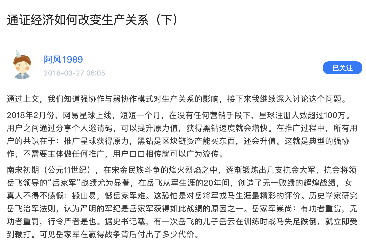 今天的公司管理类似于治军,大多数公司都会制定出重奖有功者,严惩犯错者。从奖励与惩罚面调动人的积极性,这样的公司一般都能获得很强的战斗力。网易星球的例子,我们看到了另外一种经济模式——通证经济。区块链+Token构成的新型商业模式赋予贡献者巨大的奖励,却鲜有惩罚。这样的模式能达到类似病毒一样的扩散效应,网易星球就是一个很好的证明。于是我们找到了达成强协作的方式。