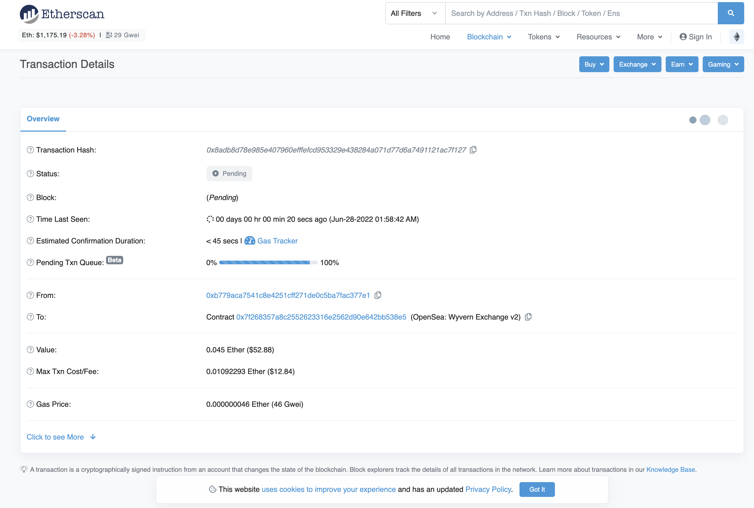 签名后交易打包上链,可以点击交易哈希,进入以太坊浏览器查看交易状态。