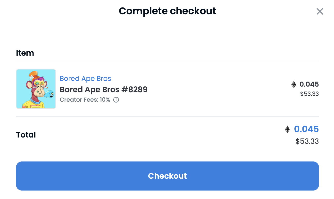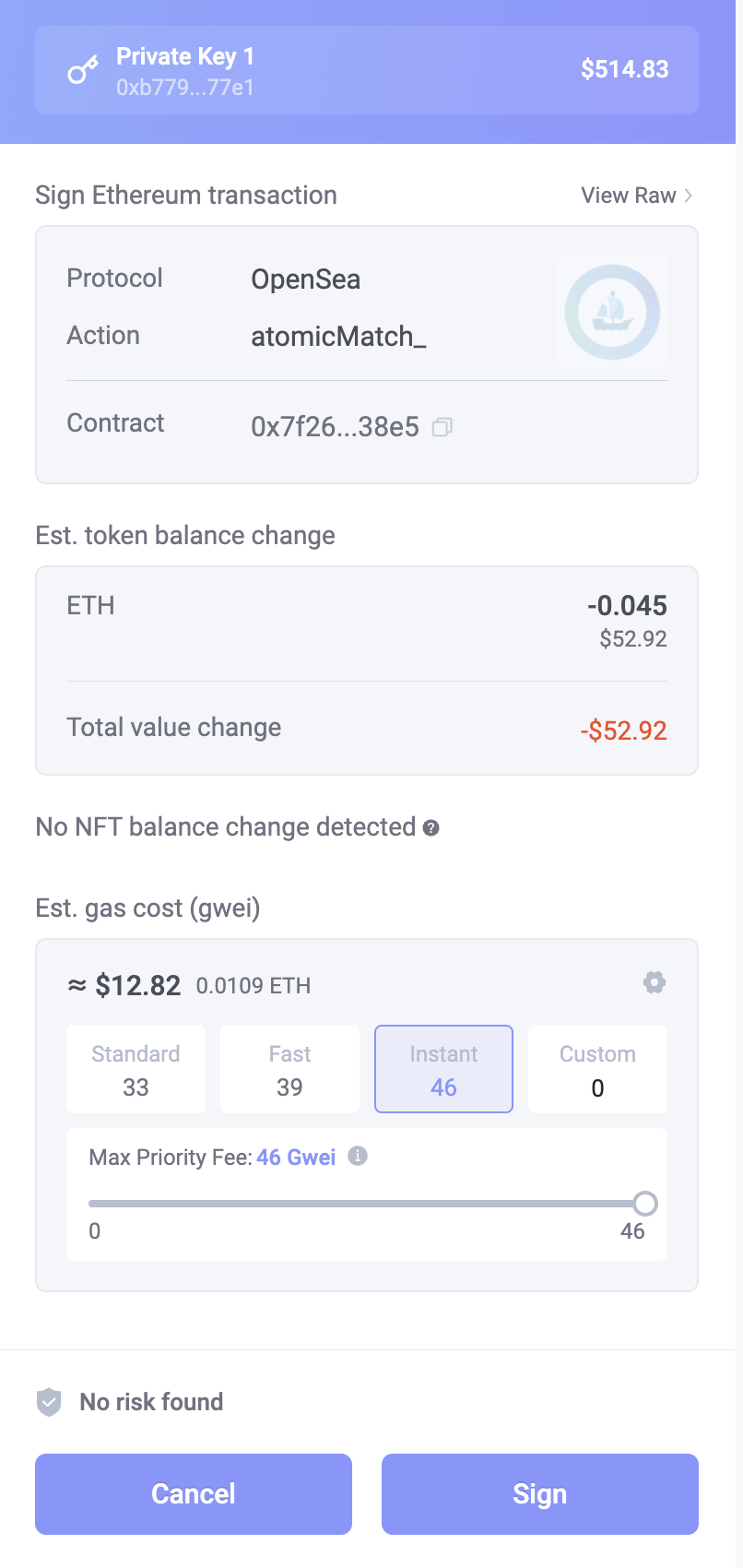 点击结账后会跳转到钱包签名页,该页面会显示该NFT的实际的价格以及该笔交易的上链手续费。