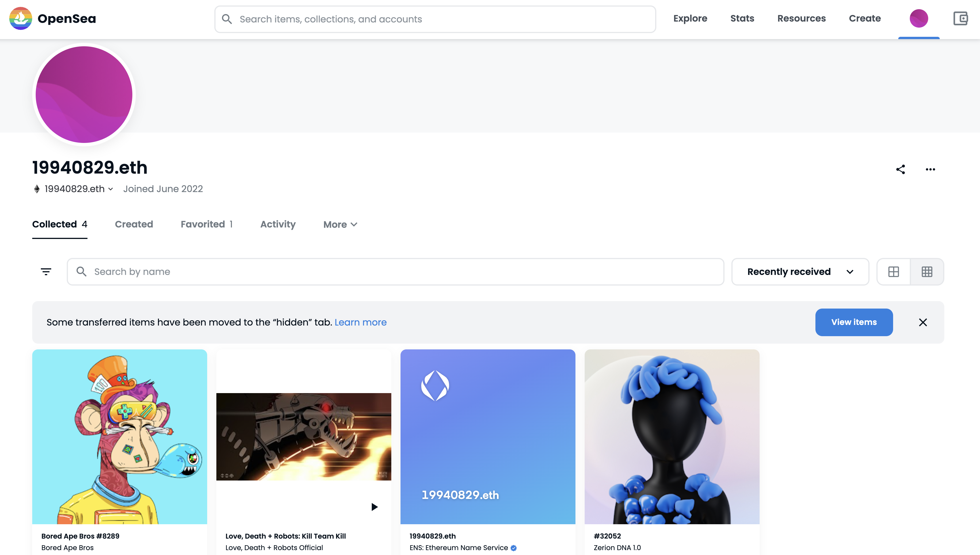 点击右上角的头像进入Profile可以查看自己购买的的NFT藏品,Opensea不会拥有或者存储你的NFT,你所有的资产都关联在自己的钱包里。
