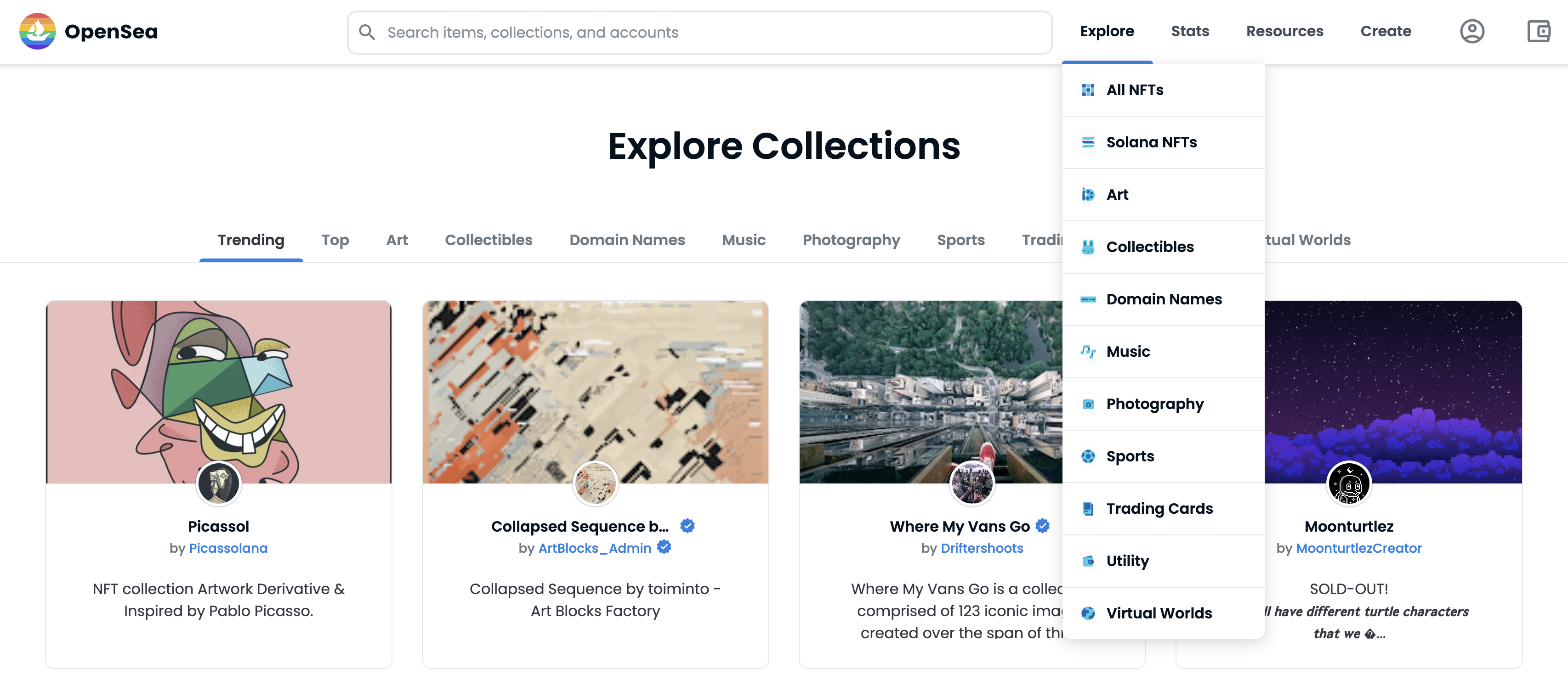 连接好钱包后就可以在Opensea的菜单栏点击探索挑选自己感兴趣的领域,比较热门的有:艺术品(Art)、音乐(Music)、域名(Domain Names)、摄影作品(Photography)、虚拟产品(Virtual Worlds)等。