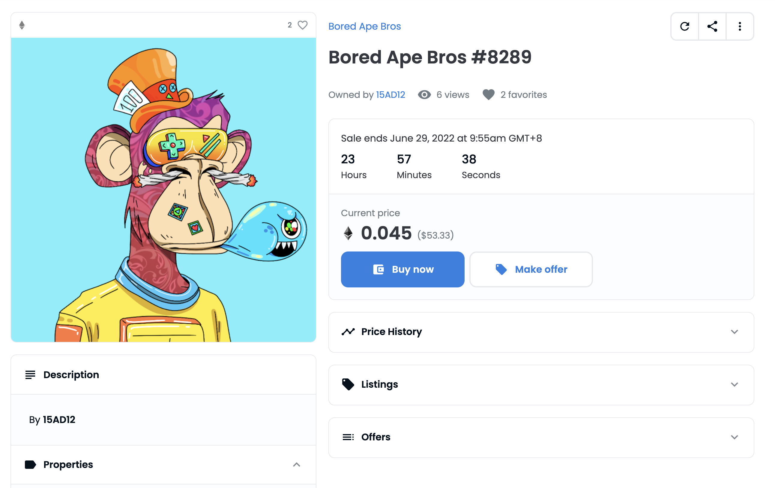 点击自己心仪的NFT查看更多详细介绍,在详情页你可以看到所有相关的资料。点击直接购买(Buy now)是以目前价格(Current price)交易,你也可以点击出价(Make offer),设定一个低于目前价格的金额,如果卖家能接受即可成交。