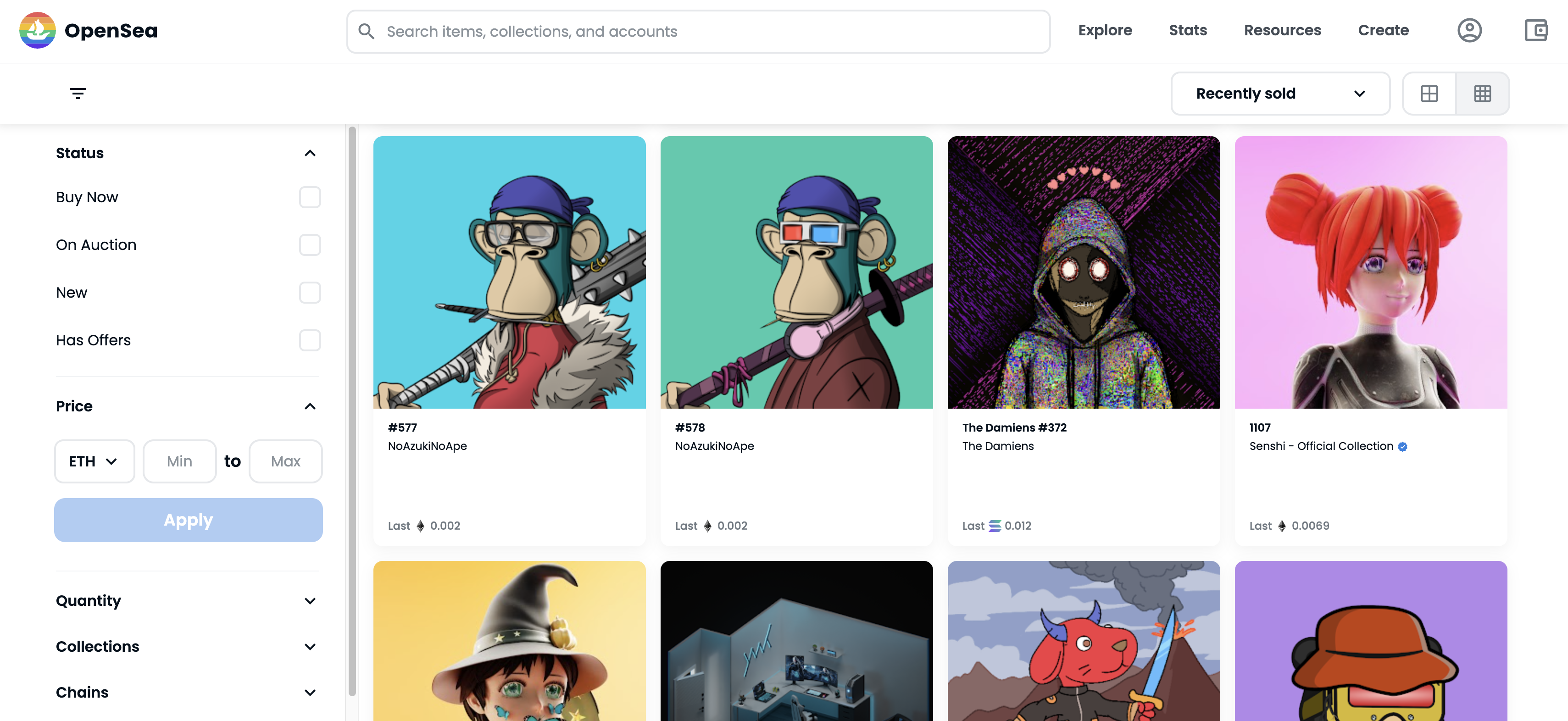 可以在左边设置筛选条件,例如自己能接受的价格范围区间,或者按热度、发行时间进行排序,帮助自己更快速的寻找适合的NFT。