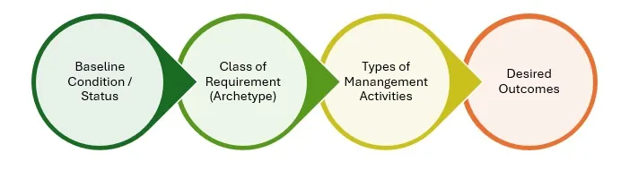 Archetypes relate to the types of outcomes that biodiversity credit schemes support and can be broadly classified as the overarching objectives for biodiversity management. These objectives serve as the management goals to guide conservation efforts, defined by the status and requirements of biodiversity for a given area (the baseline condition) and are used to outline the desired ecological outcomes. The achievement of these objectives is then measured through observed outcomes, which are the tangible, measurable changes in biodiversity and ecosystem conditions resulting from the implemented management strategies (Figure 2).