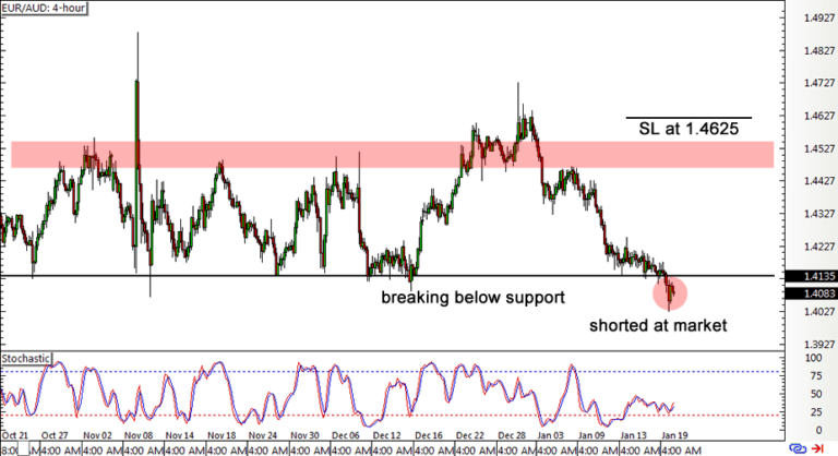 例如,在下图中,该交易者的进场时间是蜡烛收于支撑线下方时。