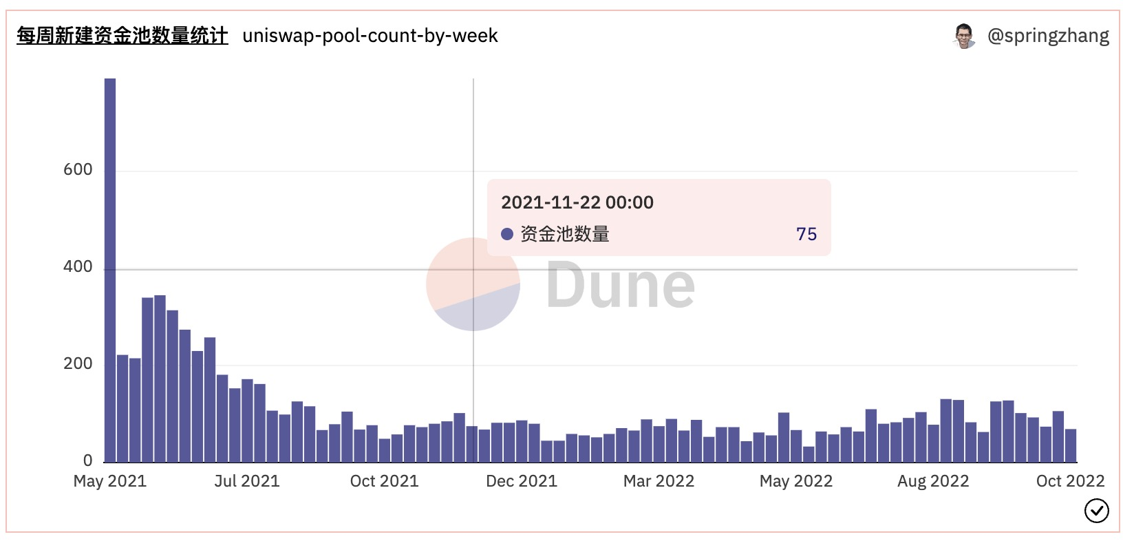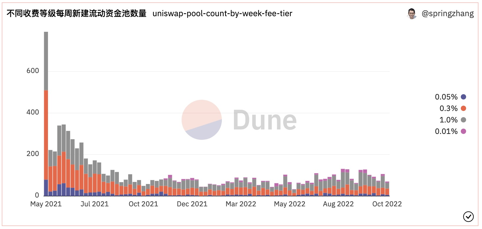 我们可以对分组统计的维度做进一步的细分,按费率来汇总统计每周内新建的流动资金池数量。这样我们可以对比不同费率在不同时间段的流行程度。这个例子中我们演示Group by多级分组,可视化图表数据的条形图的叠加等功能。