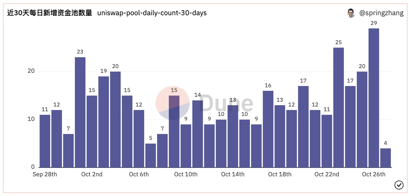我们同样使用条形图来做可视化。添加一个条形图类型的新图表,将标题修改为“近30天每日新增资金池数量”。图表的水平坐标轴(X Column)选择“block_date“,垂直坐标轴“Y Column 1”选择“pool_count”。取消勾选左侧的“Show chart legend”选项,同时勾选上“Show data labels”选项。然后把这个可视化图表添加到数据看板中。其显示效果如下: