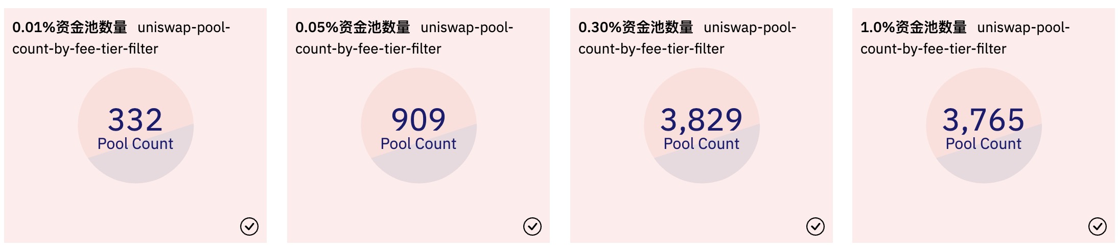 这个查询返回了4个输出值,我们为他们添加相应的计数器组件,分别命名为“0.01%资金池数量”、“0.05%资金池数量”等。然后添加到数据看板中,在数据看板编辑界面调整各组件的大小和顺序。调整后的显示效果如下图所示: