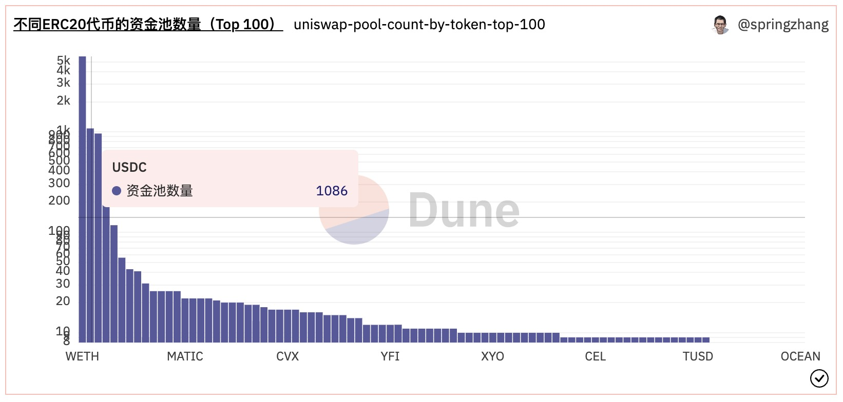 如果想分析哪些ERC20代币在Uniswap资金池中更流行(即它们对应的资金池数量更多),我们可以按代币类型来做分组统计。