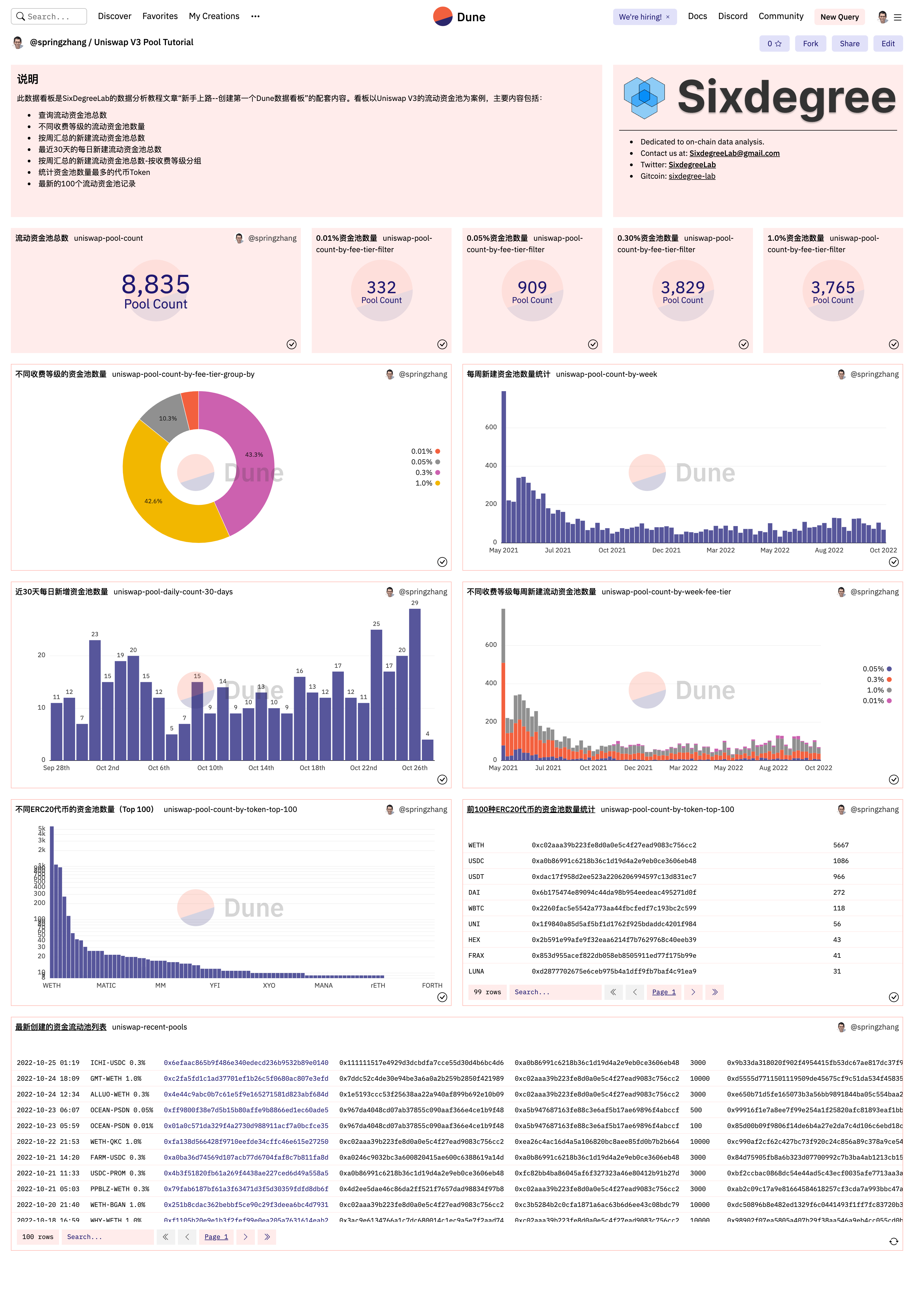 在上一篇“新手上路”中,我们学习了创建第一个数据看板需要的预备知识,掌握了基础SQL查询的编写技巧。现在让我们一起来编写查询并创建一个Dune数据看板。为了帮助大家更快上手实践,我们这个数据看板将结合具体的项目来制作。完成后的数据看板的示例:https://dune.com/sixdegree/uniswap-v3-pool-tutorial。