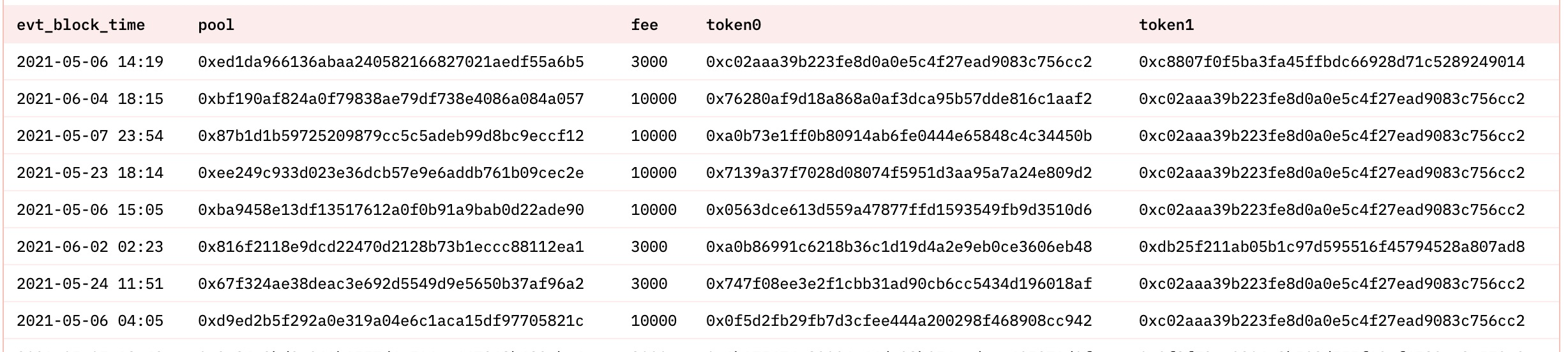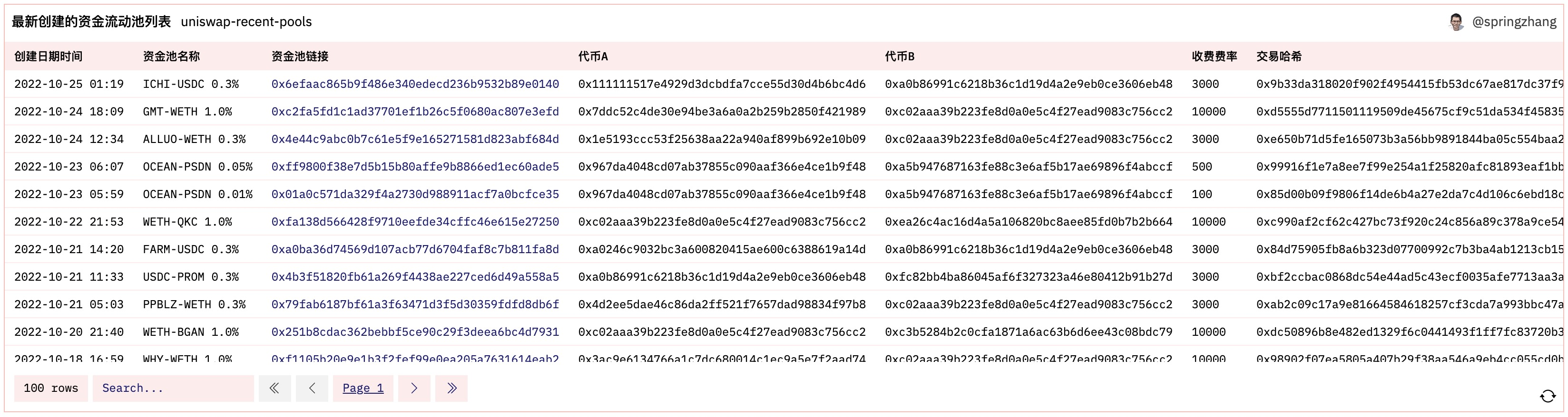 我们可以通过查询最新创建的资金池来跟踪新的趋势。下面的查询同样关联tokens.erc20