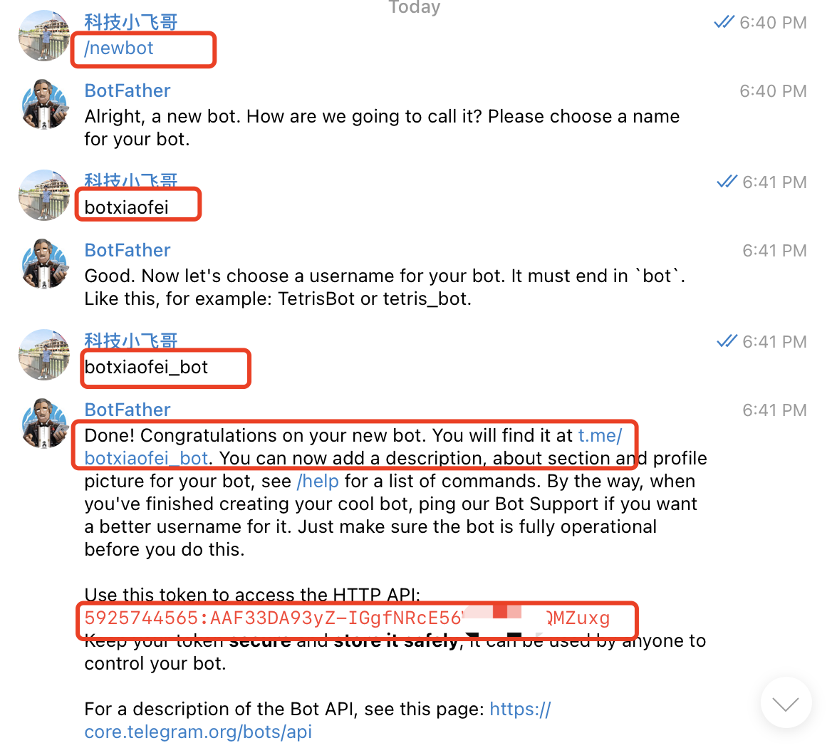 蓝色的链接就是机器人,点击进去可以聊天,红色的就是token,复制下来备用。