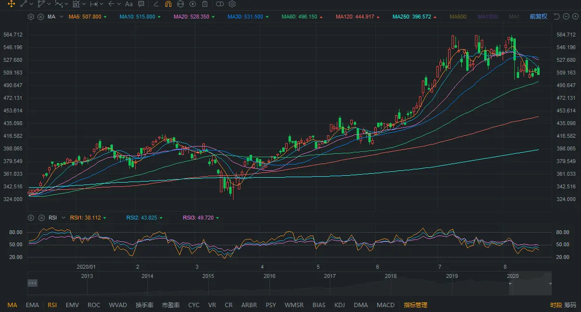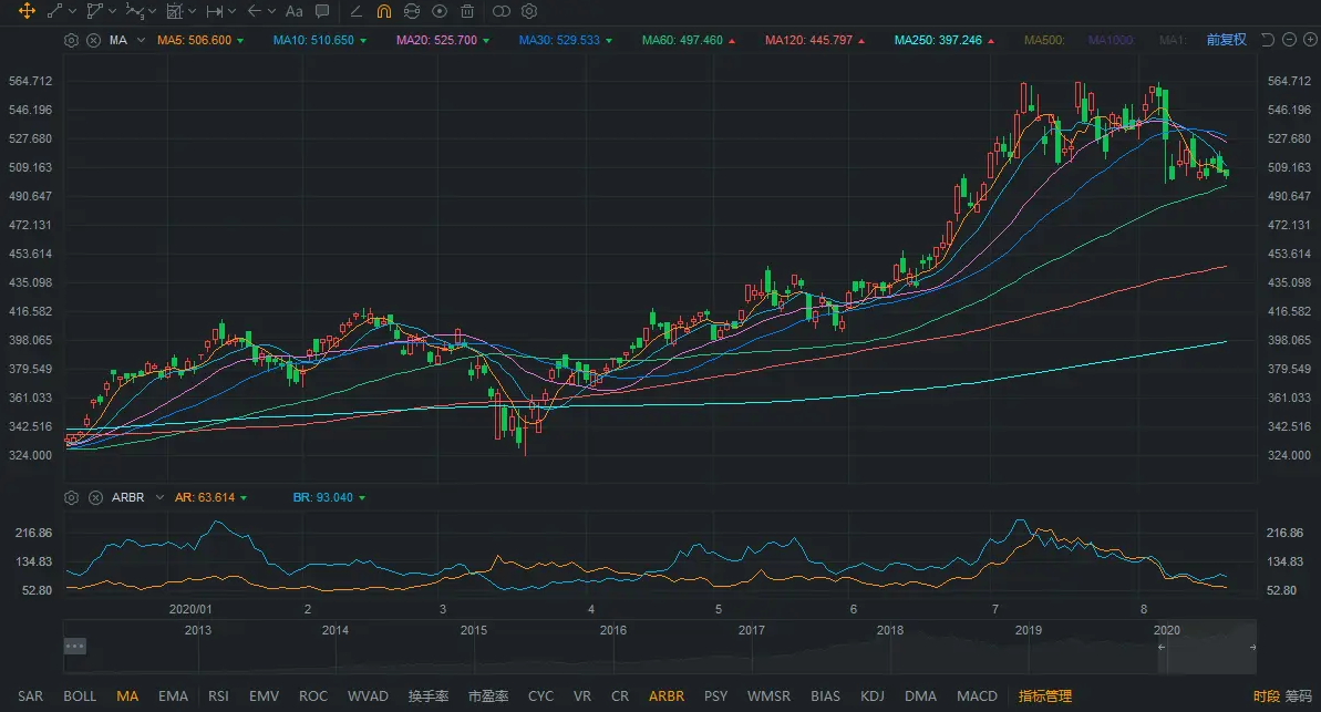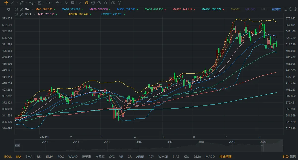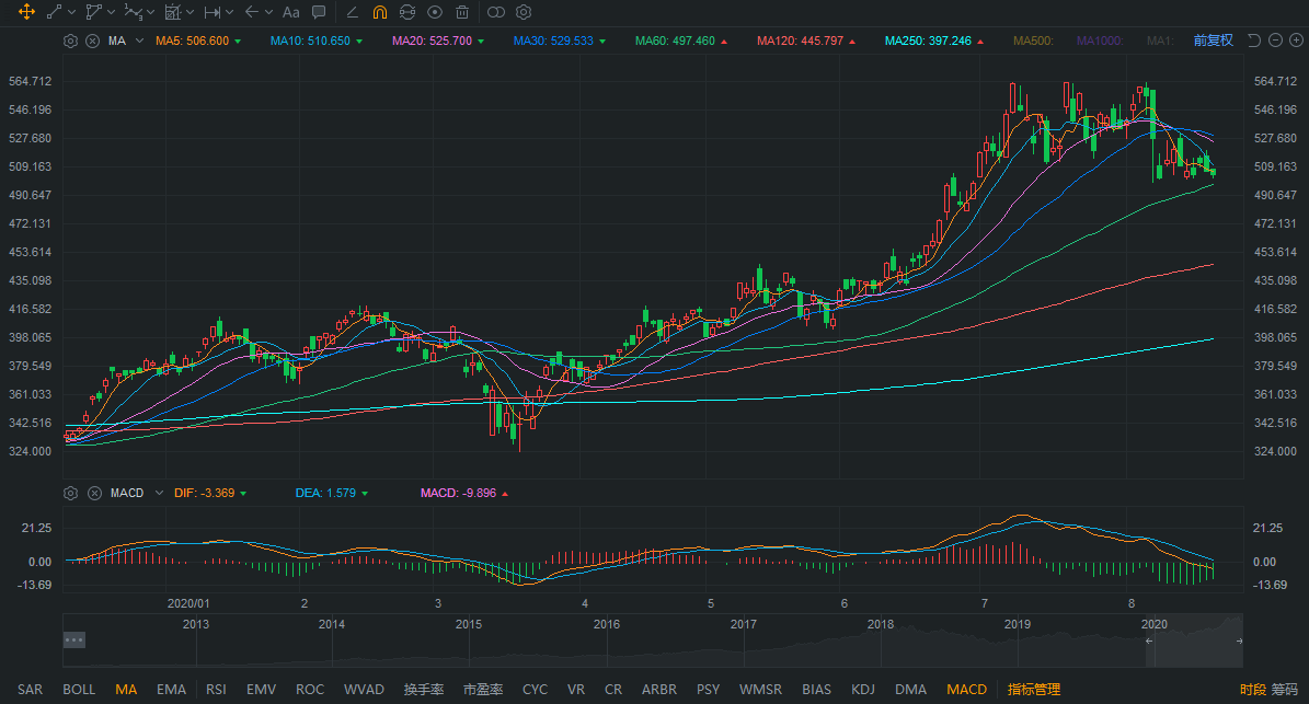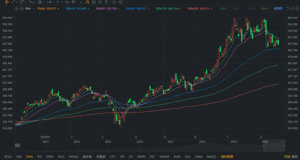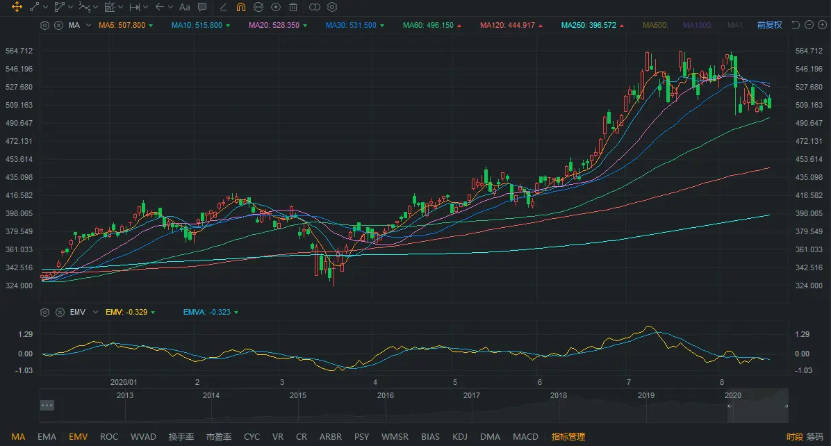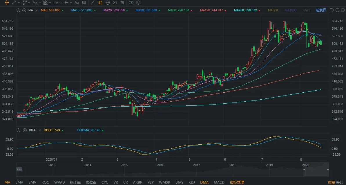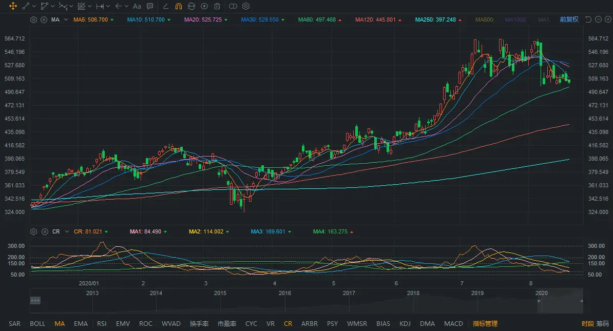 移动平均线利用统计学上移动平均的原理,将一定期间内的股价相加并加以平均,得出一个平均值,然后将其连接取得之平均线,即为移动平均线。 MA5、MA10、MA20、MA60、MA120、MA250分别对应着5日、10日、20日、60日、120日、250日的股价移动平均线。