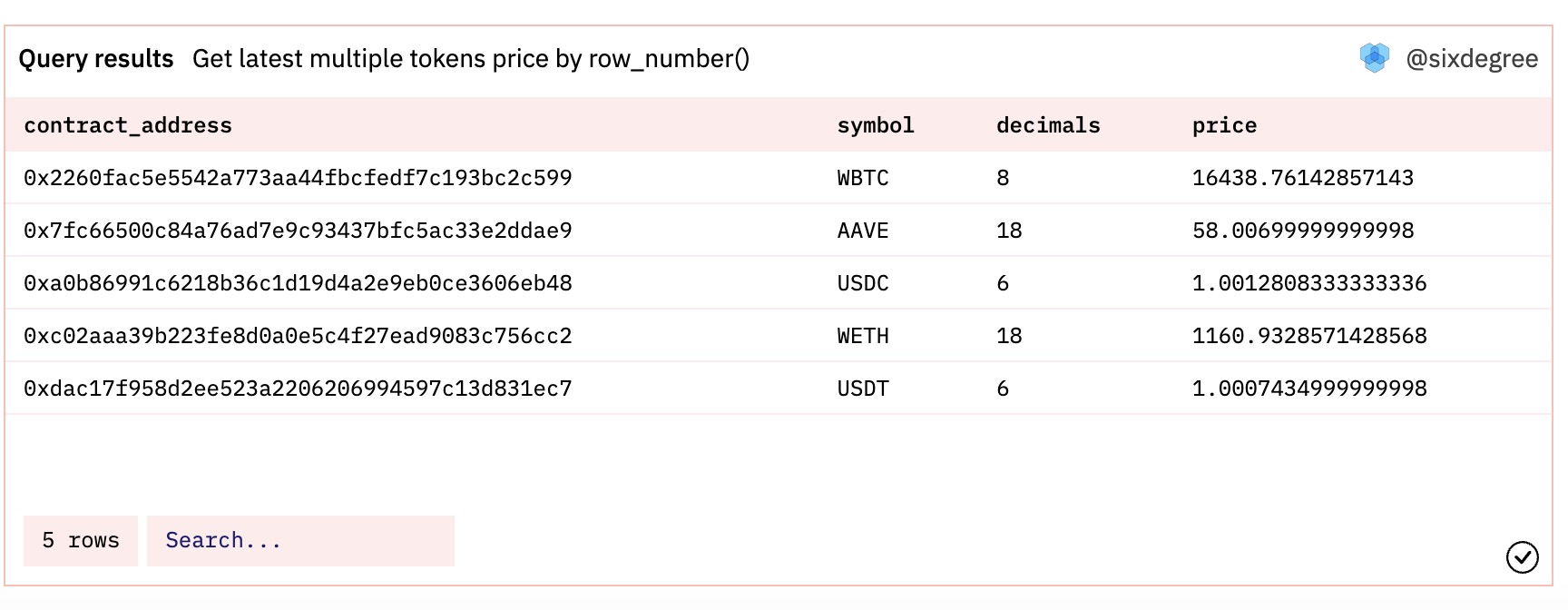 分区字句,Row_Number()将在每一个分区内部从1开始编号。利用这个特性,我们可以用来实现一些高级筛选。例如,我们有一组Token地址,需要计算并返回他们最近1小时内的平均价格。考虑到Dune的数据会存在一到几分钟的延迟,如果按当前系统日期的“小时”数值筛选,并不一定总是能返回需要的价格数据。相对更安全的方法是扩大取值的时间范围,然后从中筛选出每个Token最近的那条记录。这样即使出现数据有几个小时的延迟的特殊情况,我们的查询仍然可以工作良好。此时我们可以使用Row_Number()函数结合partition by